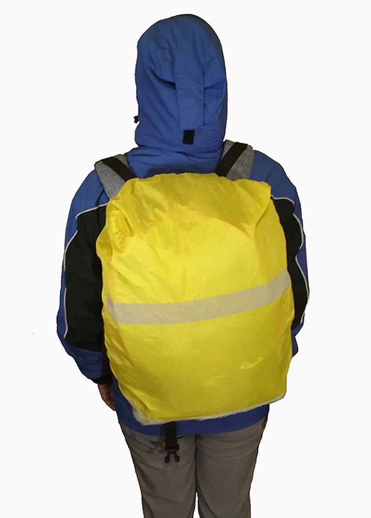 Под спинкой пластиковая пластина ля поддержания формы. Мягкая спинка с подушками. Бандажный (поясной) ремень отстёгивается. 2 боковых кармана из сеточки. Внутри имеется карман для плеера и выход наушников. Накидка от дождя не родная. Цена без учета доставки.