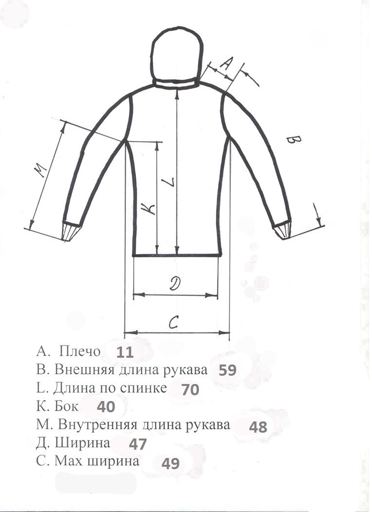 Код На рост, см Обхват груди, см Обхват куртки, см Плечо+рукав, см Длина по спинке, см Капюшон Цена грн. Описание Фото