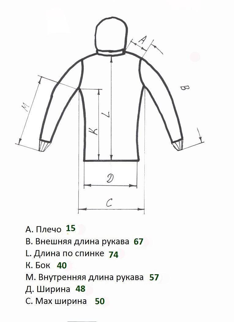Код На рост, см Обхват груди, см Обхват куртки, см Плечо+рукав, см Длина по спинке, см Капюшон Цена грн. Описание Фото